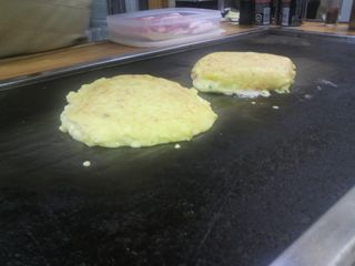 注文したのは、豚玉、チーズコーン、焼きそば、最後に厚揚げ?でした。